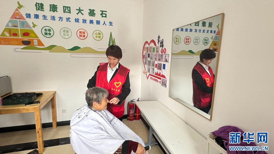在武汉市青山区中交江锦湾小区的共享理发屋,理发师张琳正在为老人理发。(新华网记者邓楠摄)